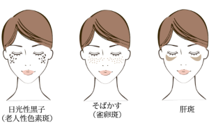 実際には、日光黒子(老人性色素斑)、雀卵斑(そばかす)、ADM(後天性真皮メラノサイトーシス)、肝斑、炎症後色素沈着など、複数の異なる疾患の総称として使われます。